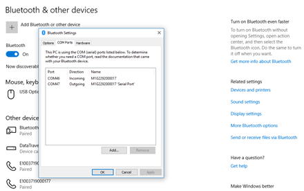 1. Connect PC or Laptop to the M1G2 through Bluetooth, and click “more Bluetooth option” to get the serial port over Bluetooth. Or you can connect the COM3 of the DB-26 Extension Dock to the PC or Laptop though RS232 serial port cable.