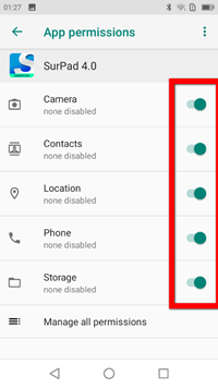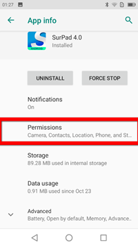 It might be caused because that the P8II doesn’t ask enough permissions when you install the SurPad 4.0, you should enable the permissions for access storage.