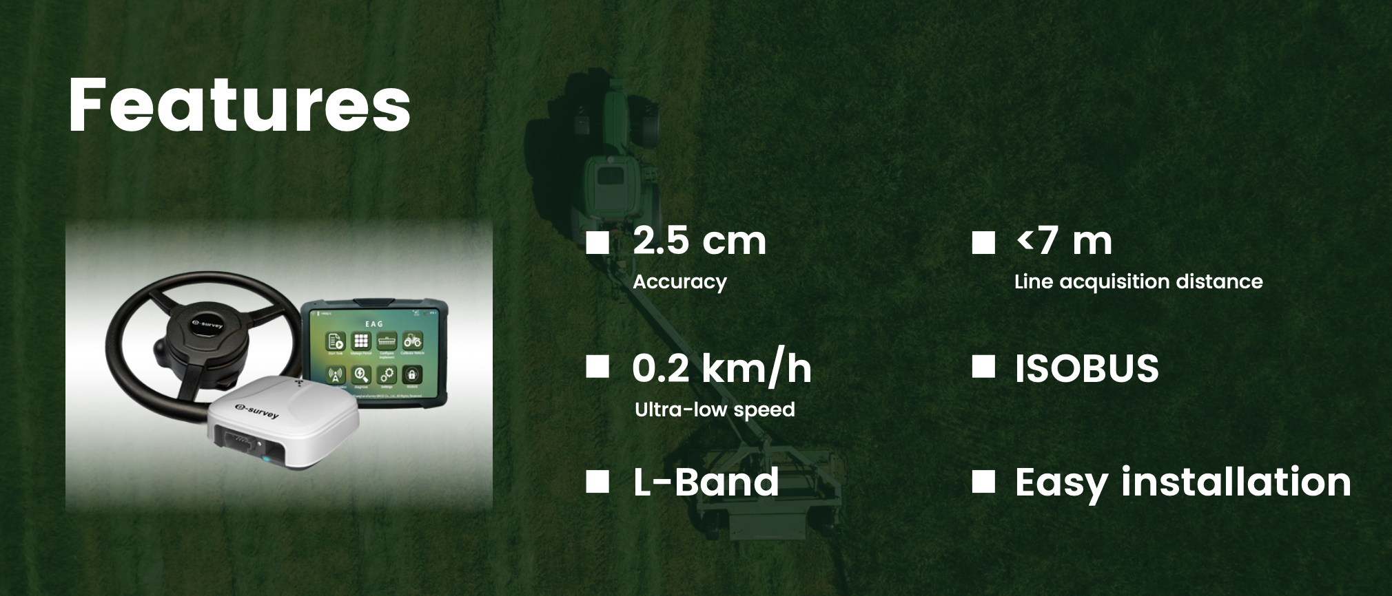 Independently developed by eSurvey GNSS, the eSurvey Bestar 301 is a multi-functional electric wheel-based auto-steering system. The Bestar 301 could transfer farm work from fully manual driving to semi-automatic operation. It means high time efficiency and less operator fatigue. Based on the route planning algorithm, the vehicle could go through the same paths every time to seed, spray and harvest with ±2.5 cm accuracy, which increases crop yield and reduces chemical usage.