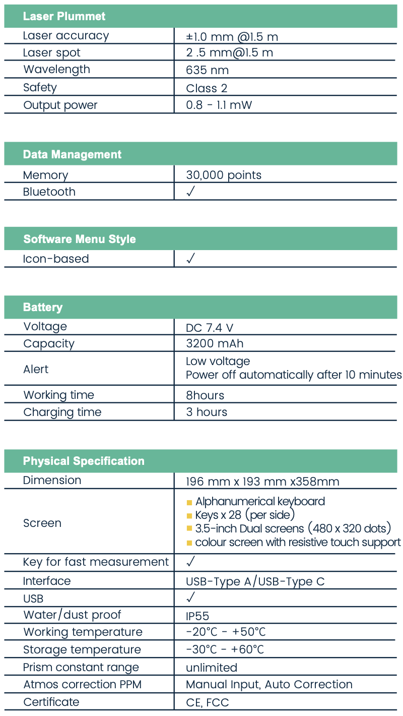 The eSurvey eTS32 is a high-performance total station engineered for surveyors demanding exceptional accuracy and efficiency. The 3.5-inch color touchscreen simplifies operation, while integrated dual-axis compensation and automatic temperature/pressure correction eliminate manual adjustments. The eTS32 excels in construction layout, topographic surveys, and engineering applications, reducing setup time by 40% while maintaining high angular and distance accuracy. With multiple connectivity options, users can transfer data seamlessly and charge the device via portable power sources, making it the ultimate all-in-one solution for demanding surveying tasks.