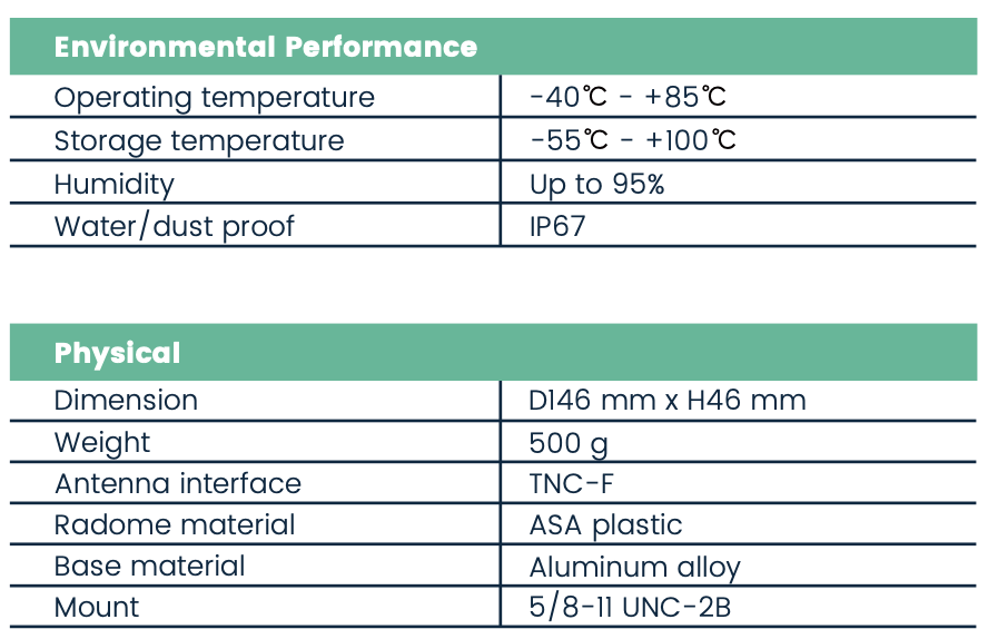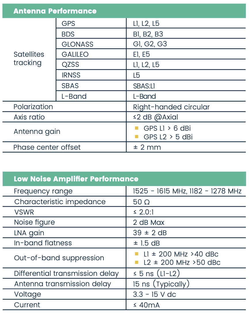 High Gain (GPS L1 > 6 dBi, GPS L2 > 5 dBi)